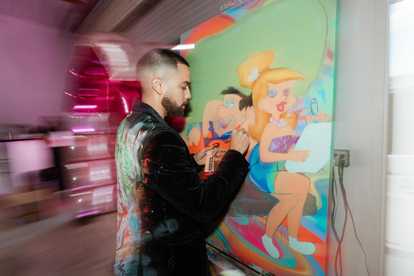 Flores first fell in love with spray paint, a medium that remains central to his practice. Self-taught, with only brief formal training in high school, he developed his craft through hands-on experimentation. His work combines spray paint, brushwork, stencils, markers, layered paper, and nostalgic comic imagery to create vibrant, intricately detailed compositions. Cartoon characters from his youth are recontextualized within dynamic pop-infused backgrounds—blending street art and contemporary pop art into a style uniquely his own.